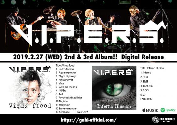 株式会社インセクトノイズの音楽レーベルFar Channel Records所属のオルタナティブ・アーティストグループ【 V.I.P.E.R.S. 】が2019年2月27日に会場限定発売されていた2nd Album【Virus flood】と3rd Album【Inferno Illusion】の過去2 作品を同時にデジタルリリース決定。