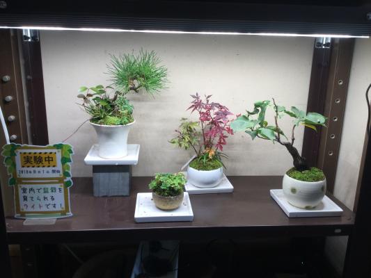 室内では1週間、もっても1か月と言われてきた盆栽。さいたま市盆栽町にある盆栽園「清香園」様との2年間にわたる共同実験により室内での育成を実証しました。鑑賞用としても鮮やかに盆栽を照らします。