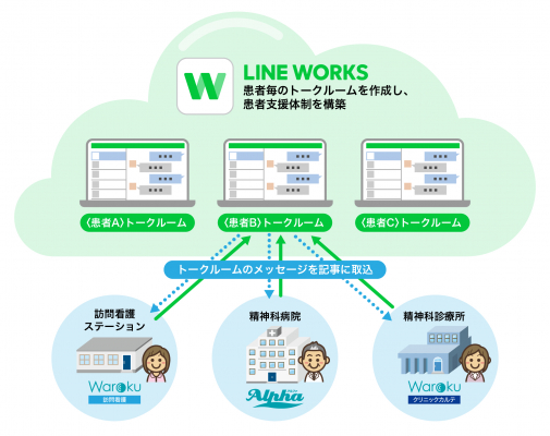 将来的にLINE WORKSを活用した医療・行政・介護・訪問看護、精神障害者、家族間の連携を目指す