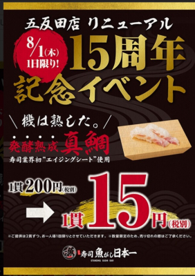 株式会社にっぱん(本社:東京都千代田区、代表:近藤洋一)は、2019年8月1日(木)に立ち食い寿司『寿司 魚がし日本一 五反田店』をリニューアルオープンします。