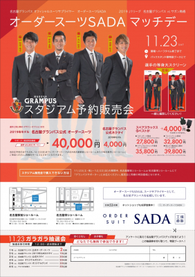 工場直販オーダースーツSADAは、11/23(土)に豊田スタジアム特設ブースにて、11時30分頃からハーフタイム終了迄の約3時間、2019年モデル名古屋グランパス公式オーダースーツのスタジアム販売会を開催致します。
