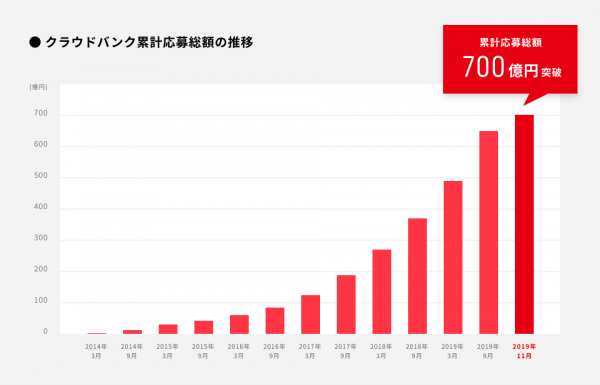 日本クラウド証券株式会社(本社:東京都港区、代表取締役社長:橋村純、以下「日本クラウド証券」)が募集の取扱いを行う「クラウドバンク」では、2013年12月のオープンから5年9ヶ月、2019年11月に応募総額700億円を突破いたしました。
