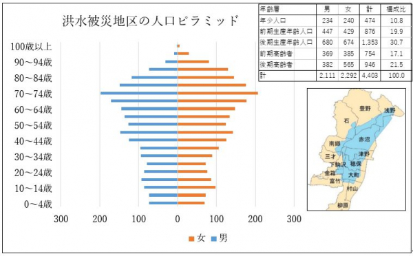 また、洪水被災地区の推計人口は4千4百人で、高齢者が38%を占めています。特に注目されるのは、被災人口の2割が75歳以上の後期高齢者で9百人に達しました。(人口ピラミッドと表)。