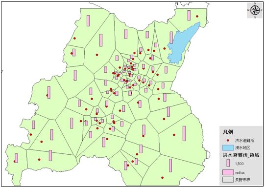◆洪水避難所への移動距離と洪水ハザードマップと洪水被災地区の重ね合わせ