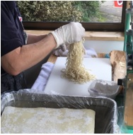 熟成庫を店舗に完備し、徹底した温度管理の下、ゆっくりと満遍なく「麺帯」を熟成させています。この熟成された板状の麺を、線状に切り、人の手で手もみを行うことで、不ぞろいではありますが、コシがあり、スープもしっかりと絡む麺となります。