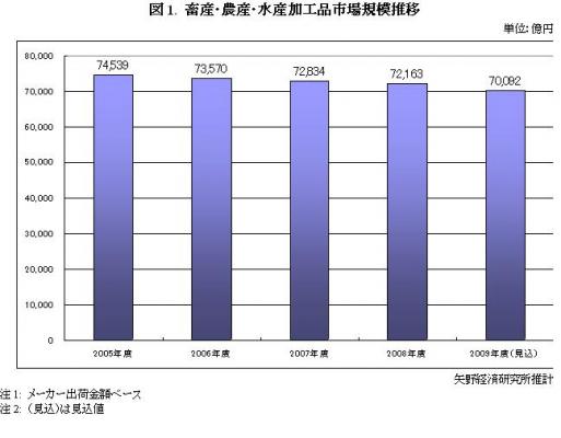 本調査における畜産・農産・水産加工品市場とは、食肉加工品(ハム類、ソーセージ類、ベーコン(市販用)、焼豚(市販用)、畜肉缶詰(市販用))、水産加工品(魚肉ハム・ソーセージ類、かまぼこ、ちくわ、揚げかまぼこ、風味かまぼこ、スモークサーモン、辛子明太子、加工海苔、かつお節類、煮干(市販用)、昆布(市販用)、わかめ(市販用)、海苔佃煮(瓶詰)、塩辛(瓶詰)、水産缶詰(マグロ、カツオ以外、市販用)、マグロ・カツオ缶詰(市販用))、農産加工品(漬物、納豆、煮豆、豆類(市販用)、きな粉(市販用)、ゴマ(市販用)、干し椎茸(市販用)、米粉(市販用)、凍豆腐、包装もち、なめ茸(瓶詰)、野菜缶詰、果物缶詰、ジャム、ピーナッツクリーム・チョコレートクリーム(市販用))が含まれ、メーカー出荷金額ベースにて算出した。