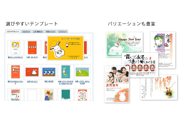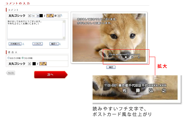 ポスコミは、文字を入力すると、すぐ横に印刷イメージを表示するため、年賀状ソフトと変わらない使い勝手を実現します。