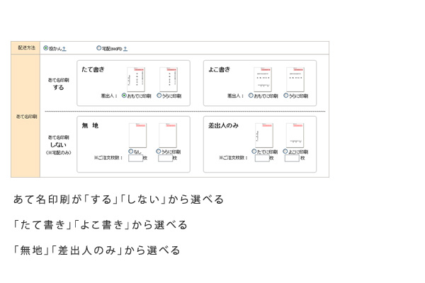 宛名印刷を「する」「しない」からお選び頂けますので、自分で宛名を書きたい方には、まとめて宅配いたします。