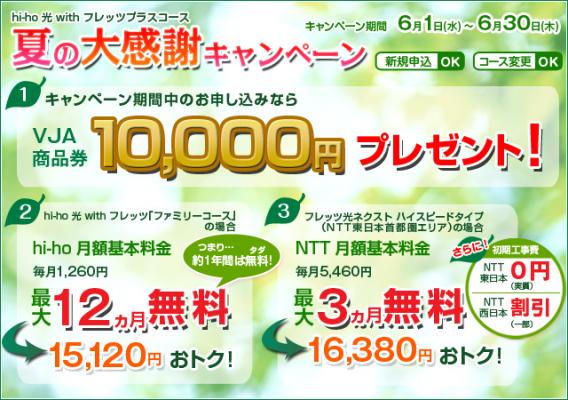 本キャンペーンでは、新規またはコース変更でhi-hoの接続サービスと東日本電信電話株式会社(以下、NTT東日本)および西日本電信電話株式会社(以下、NTT西日本)の「フレッツ光」回線取次ぎサービスを同時にお申し込みいただいたお客様を対象に、hi-ho月額料金を最大12カ月間無料にいたします。さらに10,000円分の三井住友VJA商品券をキャンペーン特典としてプレゼントいたします。