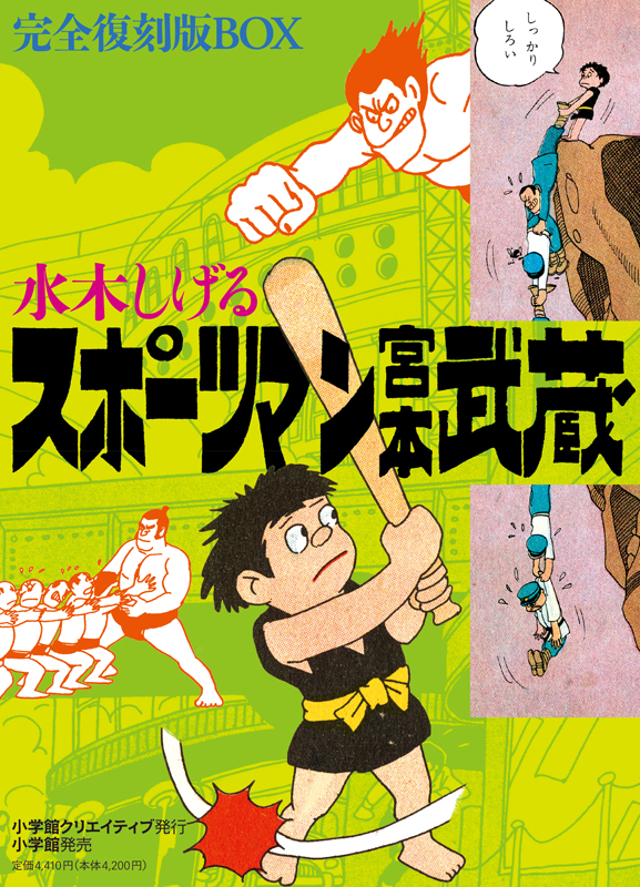 馬場のぼる「山から来た河童」、寺田ヒロオ「スポーツマン佐助」など、当時の人気児童マンガへのリスペクトと水木流の逸脱したユーモアとナンセンスが全開する、知られざる水木スポーツマンガの逸品!13代目宮本武蔵が怪レスラーや関取、さらには佐々木小次郎の末裔と対決する展開がたまりません。名品「怪獣ラバン」「地獄の水」「恐怖の遊星魔人」が描かれた1958年に、綱島出版社から刊行された幻の原本をもとに当時の造本、装丁に忠実に4色ページも再現した完全復刻版の登場です。1965年の『まんがジャイアンツ』に掲載された希少な「スポーツマン宮本武蔵 釣瓶落とし」(20P)を4色も再現した別冊付、函入り。