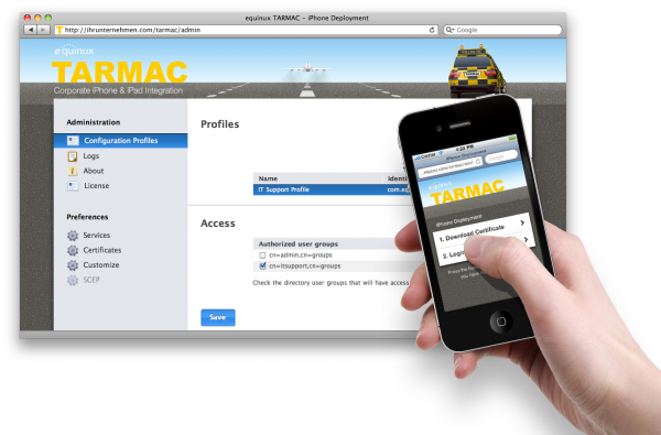 TARMACは、企業におけるiPhoneやiPadをワイヤレスで構成可能なモバイルセキュリティとその管理を実現するMDM(モバイルデバイスマネージメント)システムです。