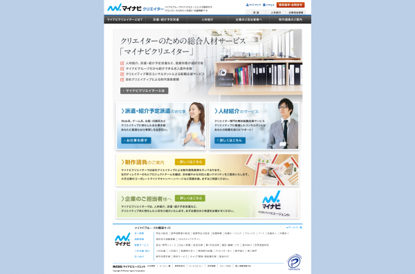 学生向け就職情報サイト「マイナビ2013」をはじめに、転職、派遣、アルバイトなど、総合人材サービス企業として、幅広い求人サービスを展開、豊富なノウハウと幅広いネットワーク網を誇るマイナビグループ。「マイナビクリエイター」では、グループの一員として、それらのリソースを最大限に活かしたサービスを展開しています。