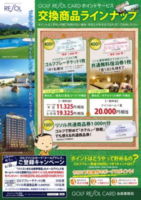 ■交換商品(1):リソルグループゴルフ場ゴルフプレー無料チケット1R1名様分(限定1,000枚で交換終了予定/平日は1枚、土・日・祝日は2枚のプレーチケットが必要/発行日より6カ月間有効)=無料会員400ポイントで交換可能。