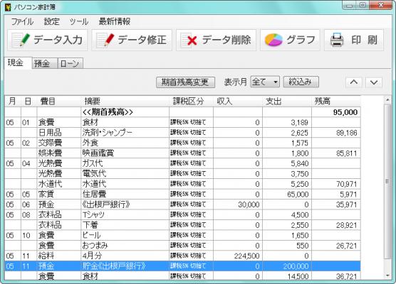 「パソコン家計簿」は、日々の収支を記入するだけのシンプル操作で、