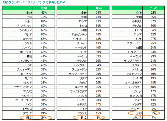 映画9%、テレビ番組9%で、音楽、映画では世界で最も少ない利用率であった。同様の傾向がみられるのは