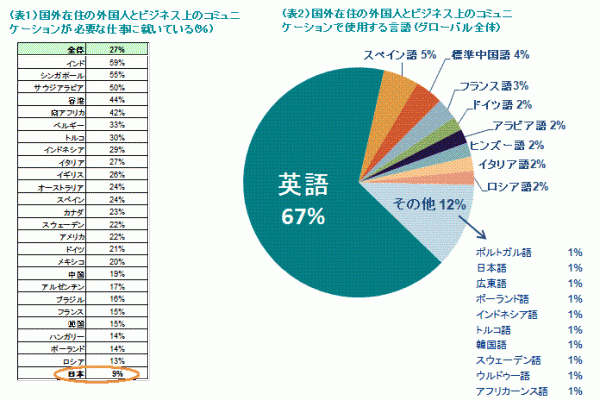今回の調査で、対象国26カ国のビジネスマンの10人に3人が「国外に在住する外国人とのコミュニケーションが必要な仕事に就いている」と回答した。その比率がもっとも高かったのはインドで59%であった。シンガポール(55%)、サウジアラビア(50%)、香港(44%)、南アフリカ(42%)がそれに続いた。日本は9%で対象国中で最下位であった。日本のほかに比率が低い国はロシア(13%)、ポーランド(14%)、ハンガリー(14%)などであった。全体で見ると外国人とのコミュニケーションが必要なビジネスマンの特徴は、高学歴(38%)で、世帯年収が高く(33%)、35歳以下(31%)との結果が出た。