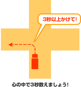 交差点の大きさにもよると思いますが、信号のない生活道路では3秒以上、信号のある交差点では5秒以上かけて曲がるようにすると、歩行者や自転車横断者の動きが観察できるようになります。