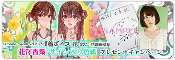 応募方法は着ボイス 花(CV:花澤香菜)に関する簡単なアンケートにお応え頂く方式となっており、抽選で4名様に花澤香菜直筆のサイン色紙をプレゼント致します。