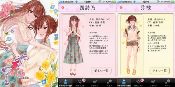 アプリ内では着信を知らせてくれる二人のキャラクター、「四詩乃」、「弥枝」の双子姉妹を一人二役で演じ、それぞれ雰囲気の違うボイスを楽しむ事ができます。
