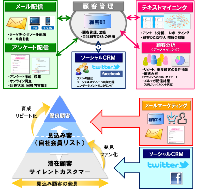 今回、プラスアルファが提供するトータルCRMシステム「カスタマーリングス」は、顧客管理やメール配信、アンケート収集といったCRM機能に加え、データマイニング/テキストマイニングなどの分析機能が充実しており、メールのレスポンス分析や購入実績(商品、金額、頻度など)に応じた顧客セグメントの発見など、様々な顧客の行動データを蓄積し、次のマーケティング施策立案に生かすことができるのが特徴です。