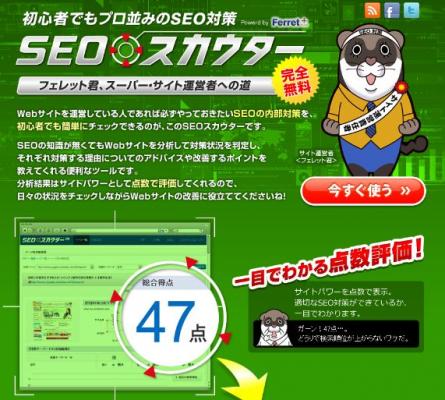 2012年4月23日に満を持してリリースした、初心者でもプロ並みにSEOの内部対策ができる「SEOスカウター」は、WebサイトのURLと対策キーワードを設定することで、全38項目よる評価項目で、SEOの内部対策状況を分析して点数を出します。