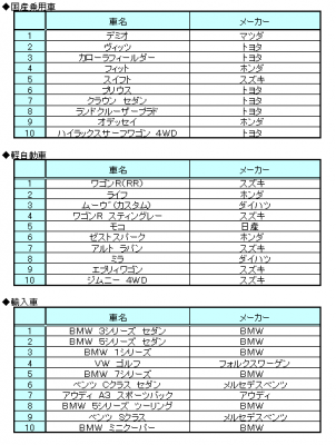 国産車部門では、1位デミオ(マツダ)、2位ヴィッツ(トヨタ)、と上位2車種は先月と全く同じ順位となりました。