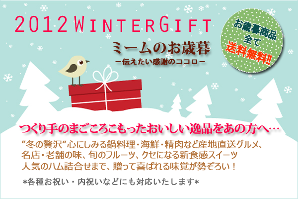 カタログギフト通販サイト「meme|ミーム」を運営する株式会社ミーム(東京都江戸川区、代表:松尾 俊彦)は、つくり手のまごころのこもった全国の名産品や老舗・銘店の逸品やトレンドグルメギフトを中心に、「2012 Winter Gift ミームのお歳暮」をスタートいたしました。