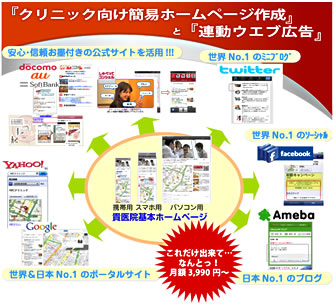 このサービスは32項目の掲載情報の記入と4枚の写真を用意することで、一日以内にホームページの掲載が完了。クリニックの情報が複数のパソコン、スマートフォン、携帯電話向けサイトに掲載されるサービスです。